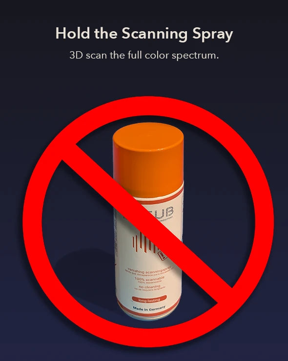 Because THREE usese the full color spectrum, scanning spray isn't needed for most objects. Scan dark or colorful objects, including those that blue lasers miss.
