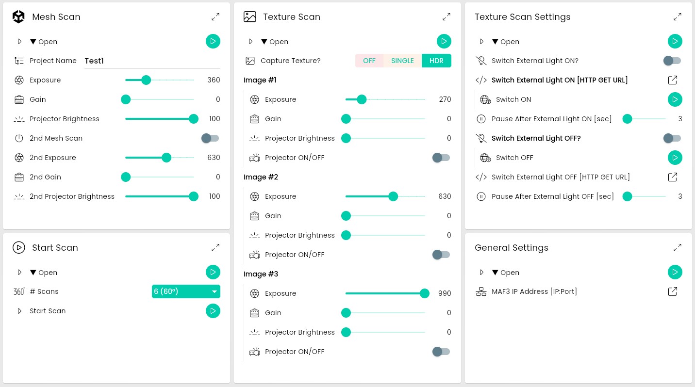 (Optional: If object has light and dark areas it might be needed to perform another turntable scan with higher exposure, gain and projector settings to also capture mesh from dark areas. This time the texture should be disabled. Later this second scan need to be aligned with first round and moved to the first project folder. Unfortunately MAF3 does not have HDR for point cloud capturing as many other structured light scanner have. So this workaround could be used.)